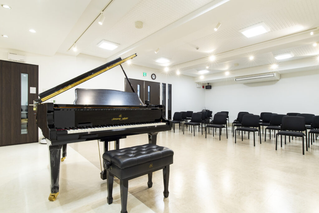 50名収容、グランドピアノ(シゲルカワイSK2)、防音控室も完備。